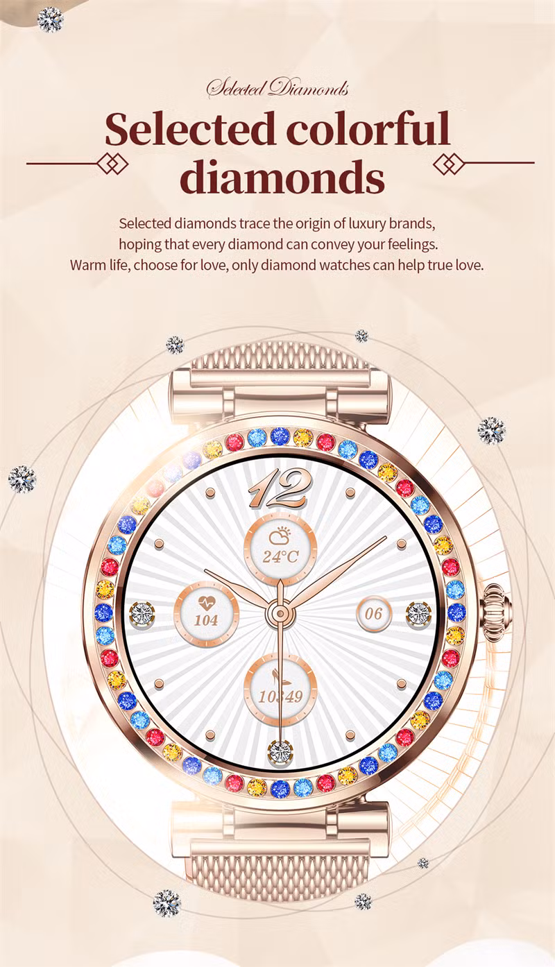 Waterproof 1.27 Inch Full Touch Diamond Screen Health Monitoring Bt Call Voice Assistant Gold Black Silver Silcone Strap Women Lady Girl CF30 Round Smartwatch